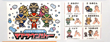 | ☆指導員青年部が交流を深めていた大津市食品衛生協会青年部の研修会への参加・視察を契機に 「園児向け手洗い教室」のアイデアを企画した。 ☆6人の「元気モリモリ洗隊テアラウンジャー」が必殺技でバイ菌達をやっつける設定の紙芝居を作成し、童謡の「うさぎとかめ」の替え歌に合わせて正しい手洗いの方法を園児と合唱。 ☆手洗いチェッカーを使って、正しい手洗い方法を学んだあと、全員に「ちびっこ手洗いマイスター合格証」を渡し、家でもおうちの人に伝えてもらうようにした。 |